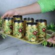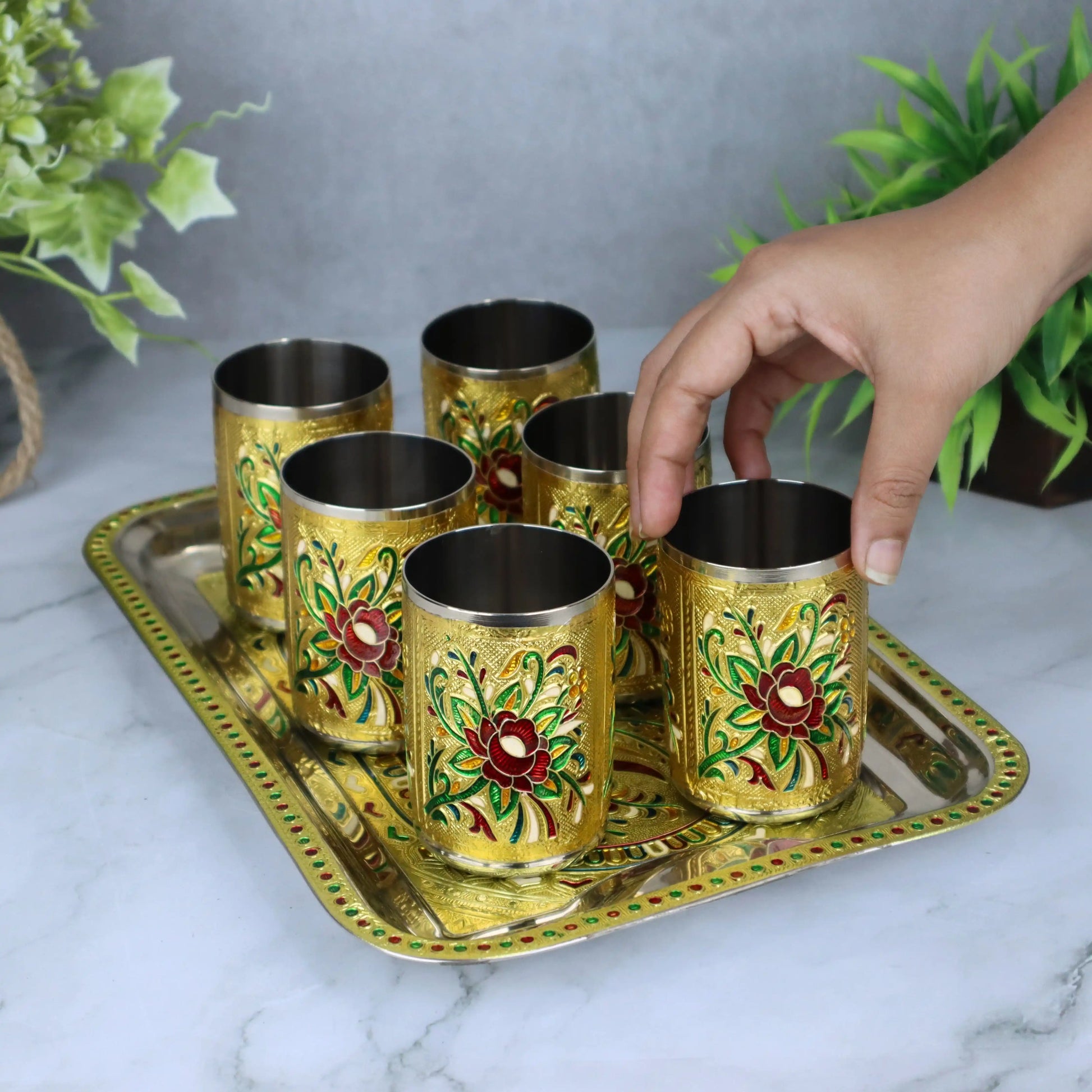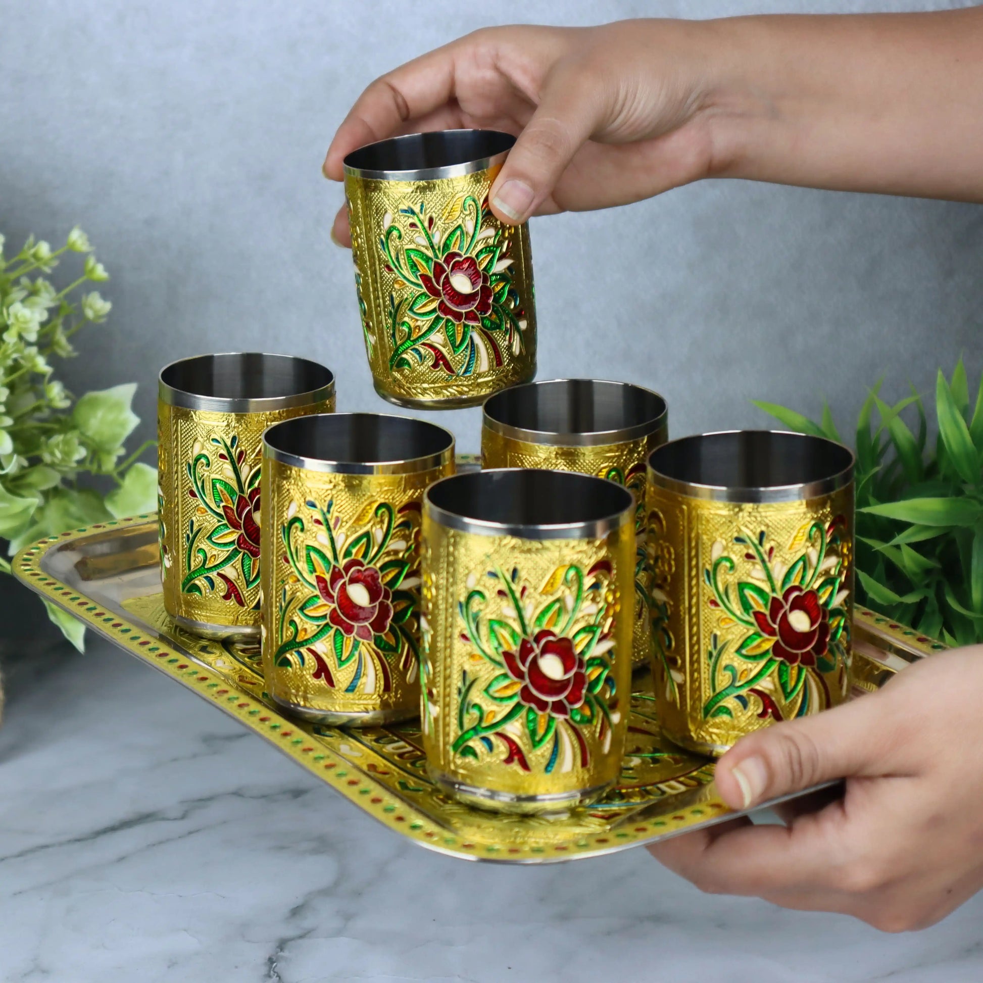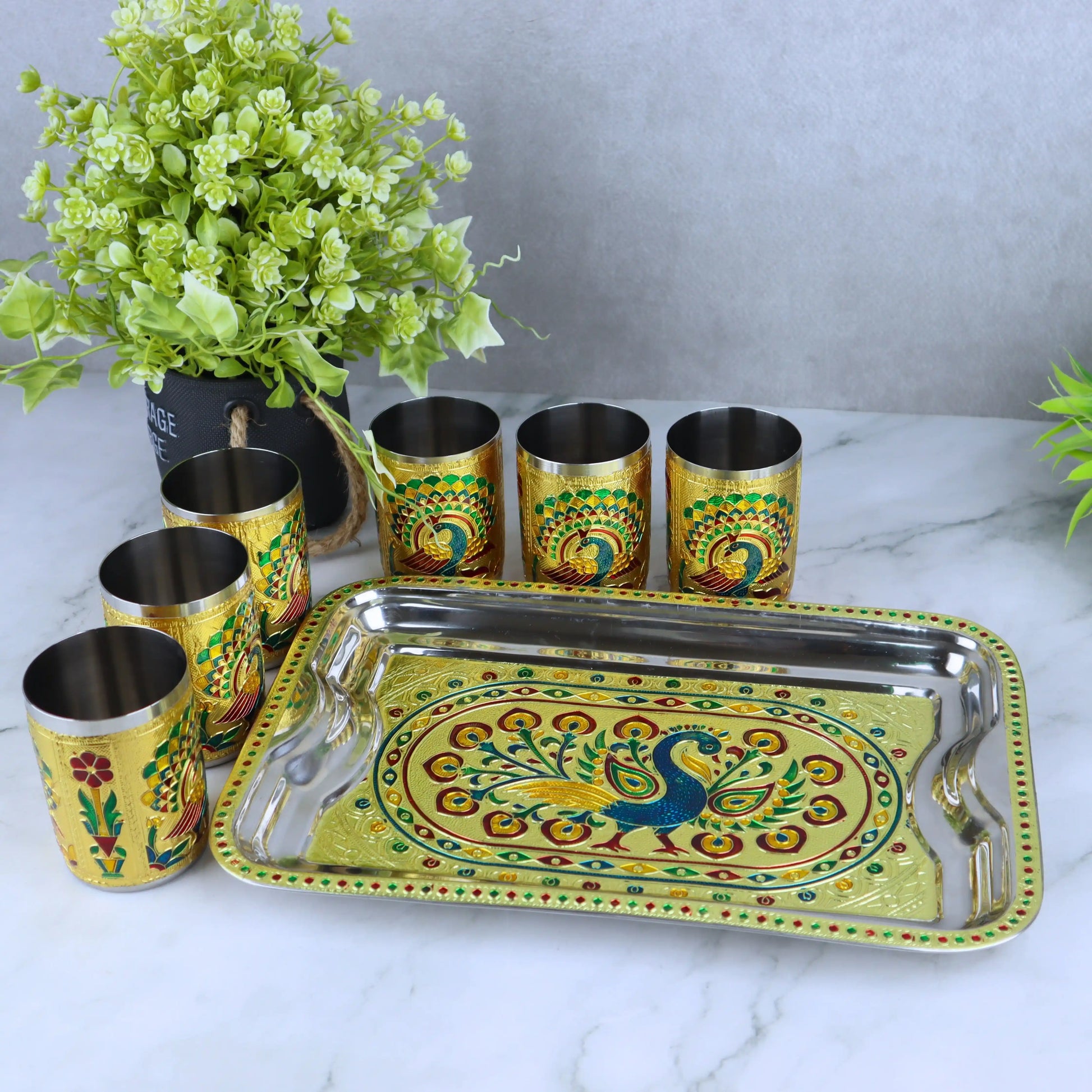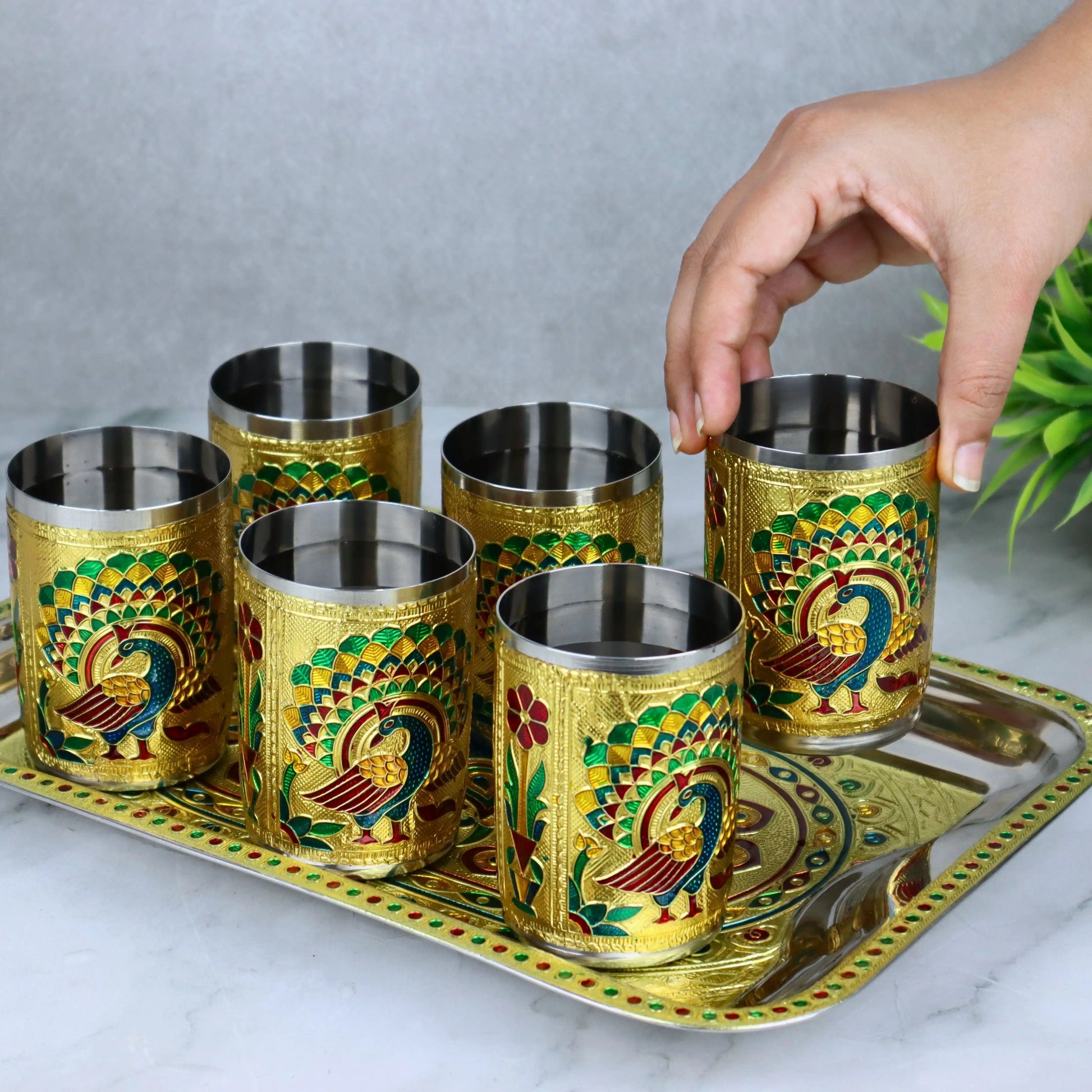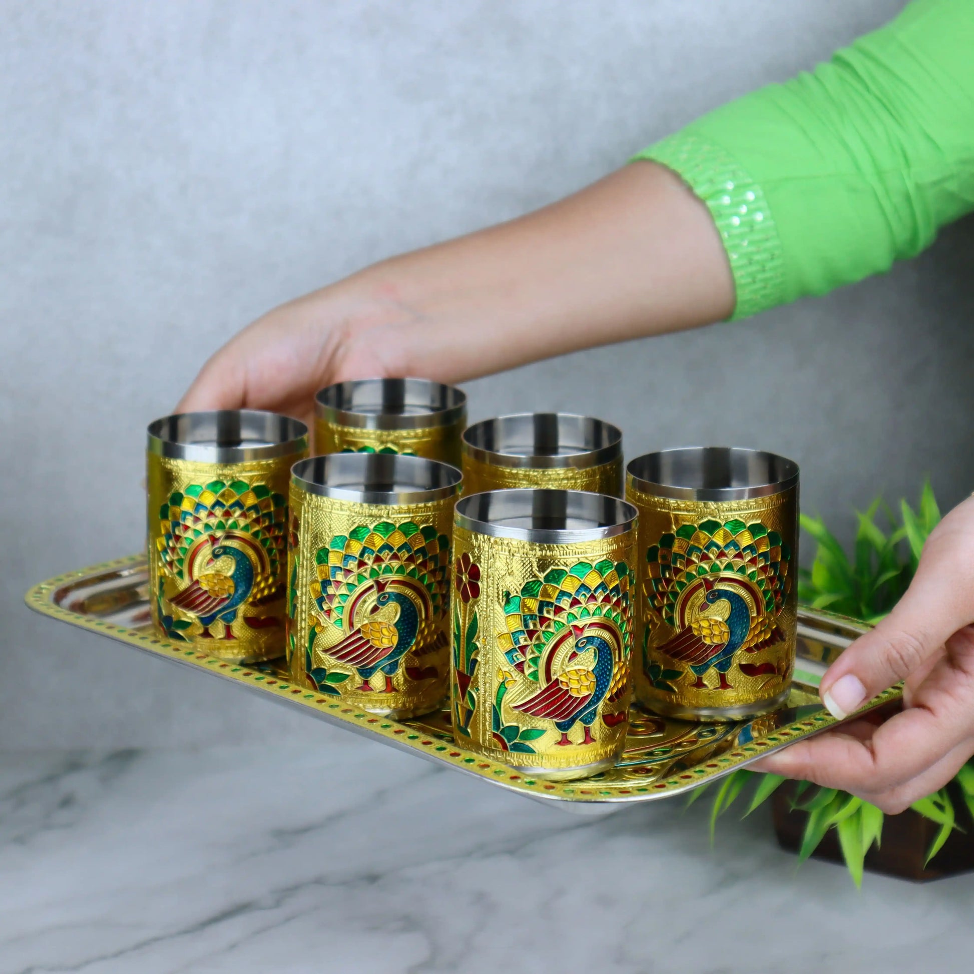 Lemon Set | Peacock & Flower Meenakari Glass Tray Set | Stainless Steel Water 6 Glasses with 1 Tray | Return Gifts