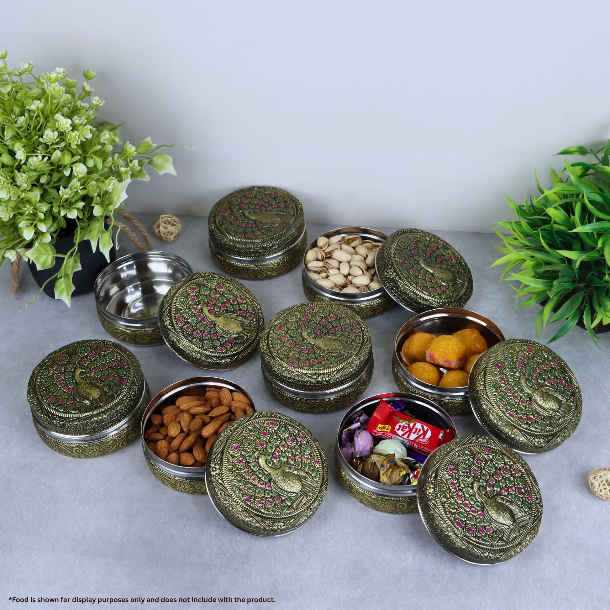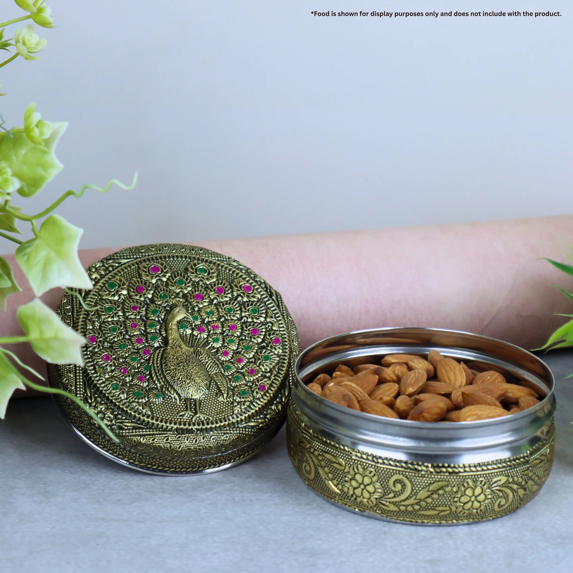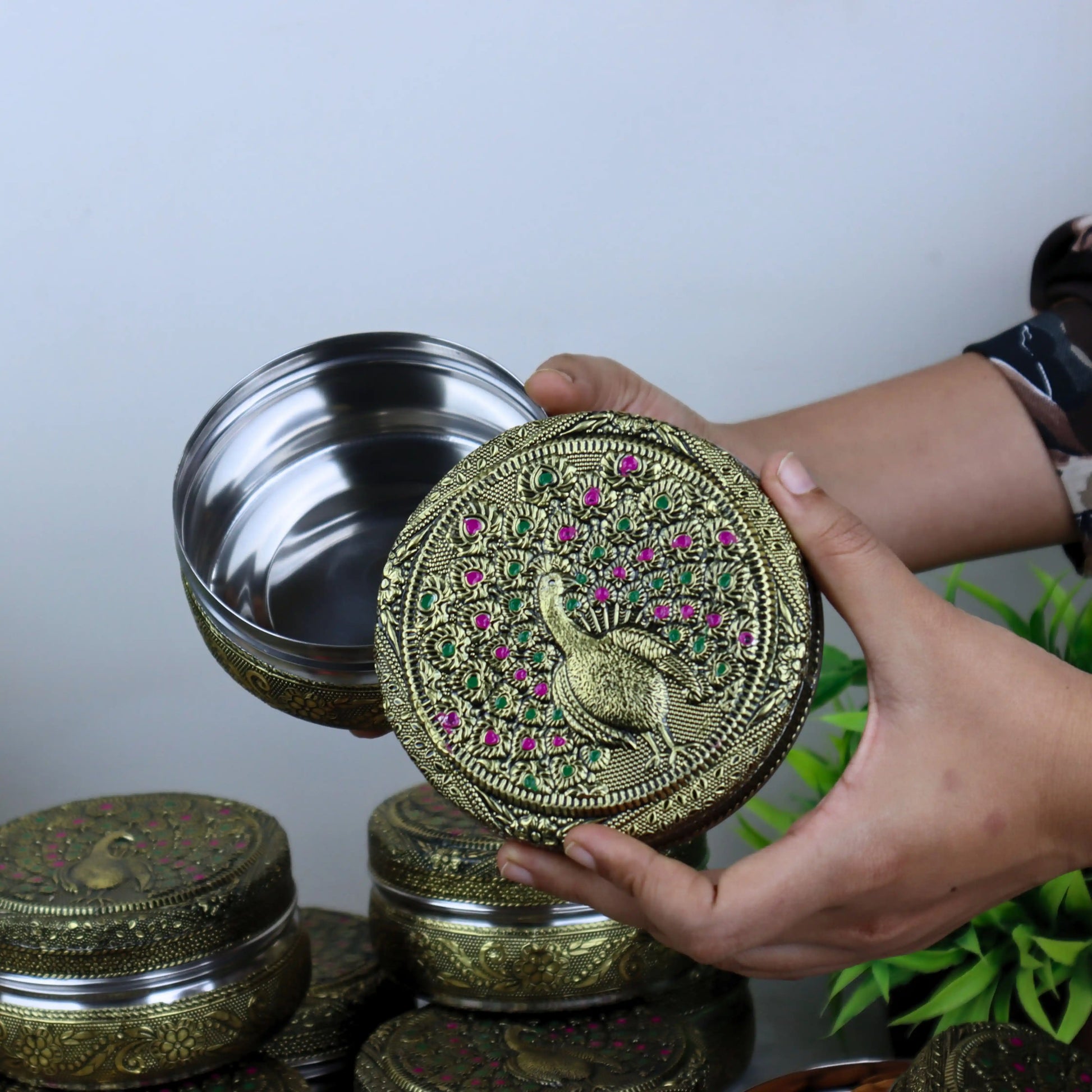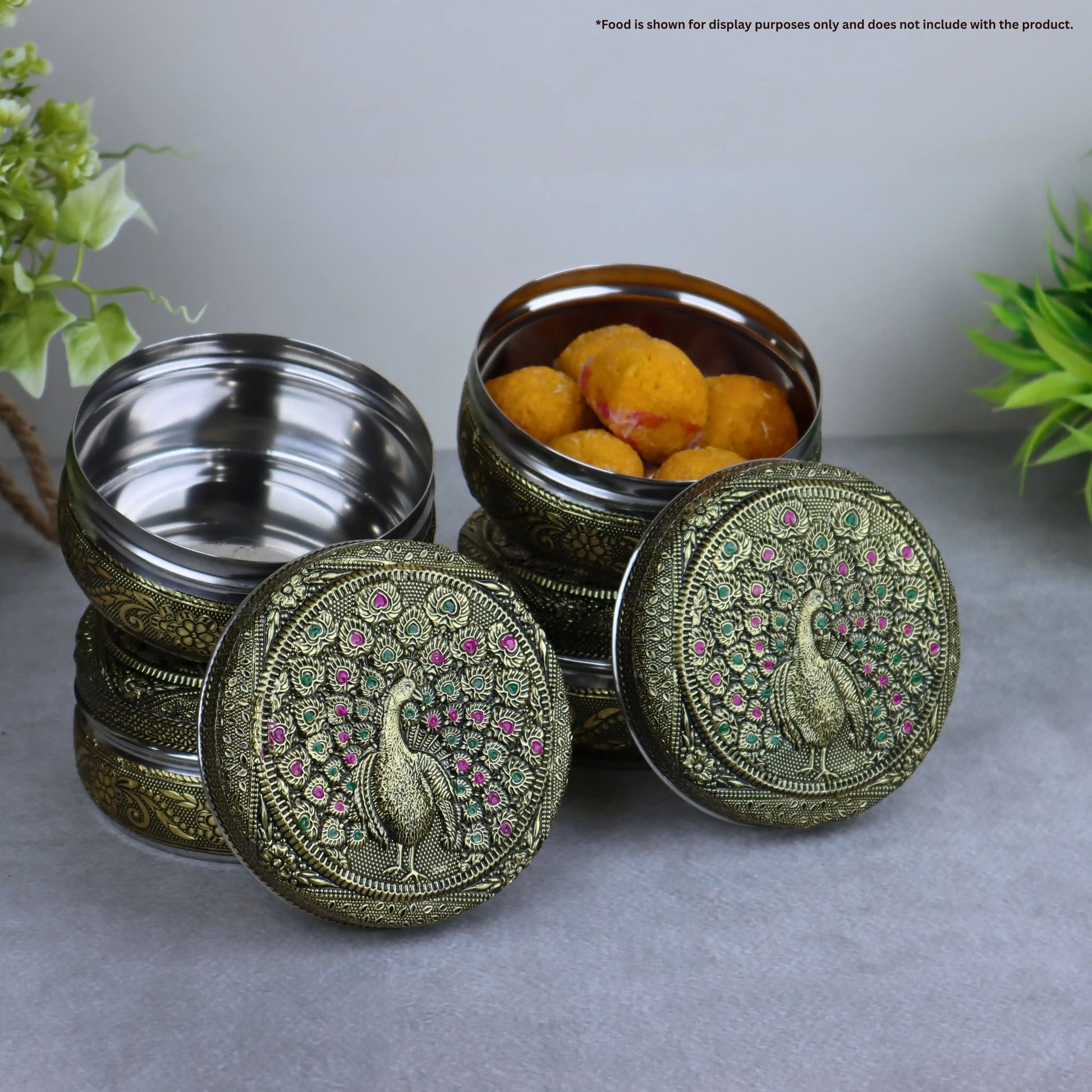 Meenakari Peacock Embossed Stainless Steel Dabri – Puri / Poori Box / Poori Dabba, Tiffin Box & Kitchen Dabba | 500 ml | Return Gift