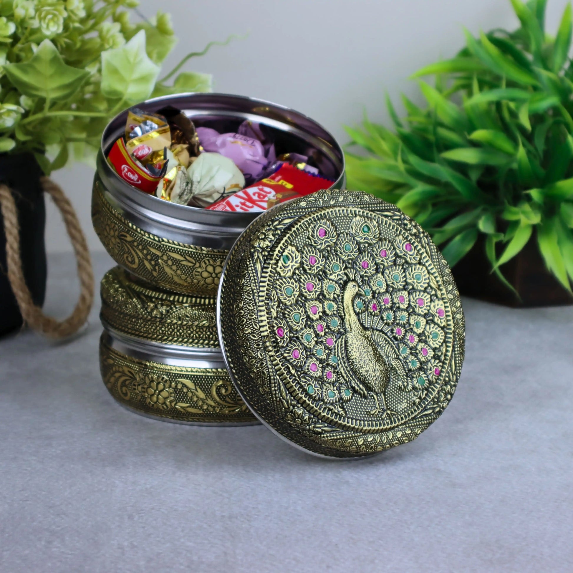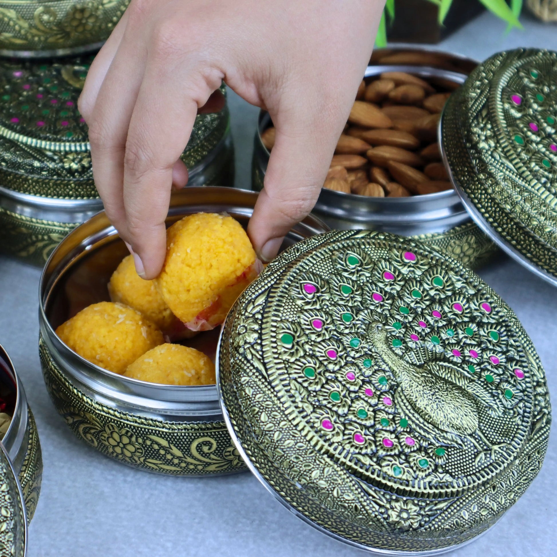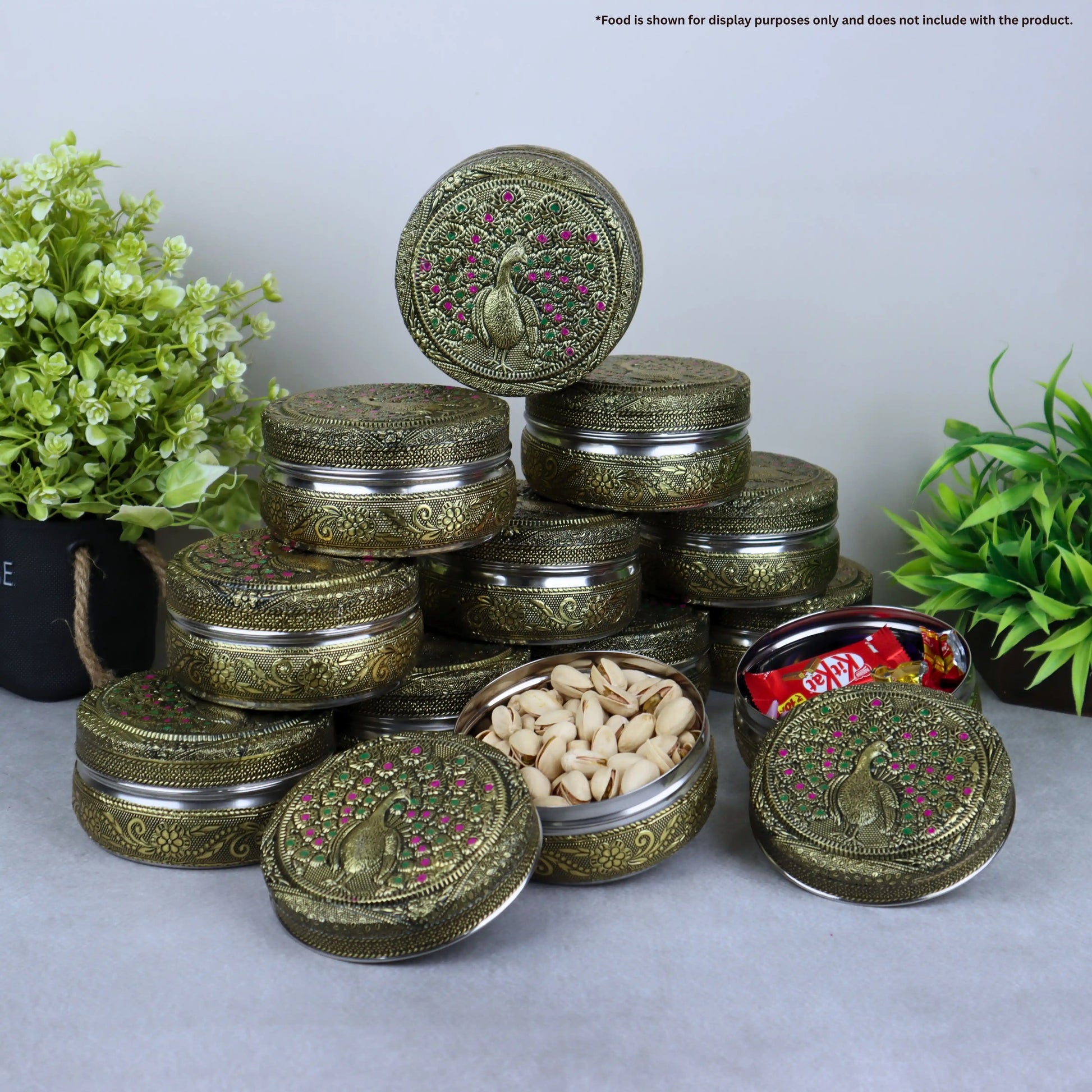 Meenakari Peacock Embossed Stainless Steel Dabri – Puri / Poori Box / Poori Dabba, Tiffin Box & Kitchen Dabba | 500 ml | Return Gift