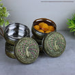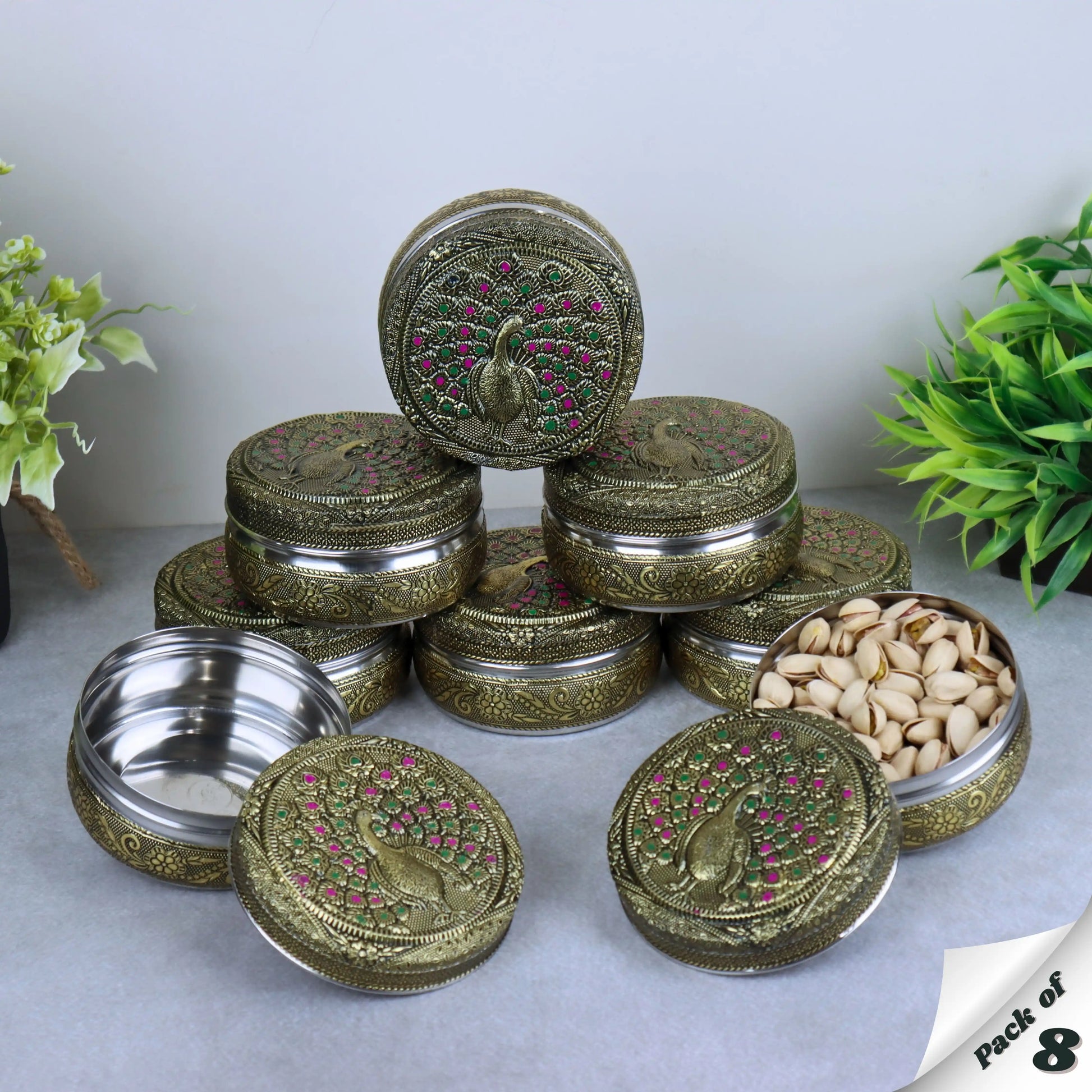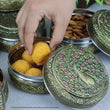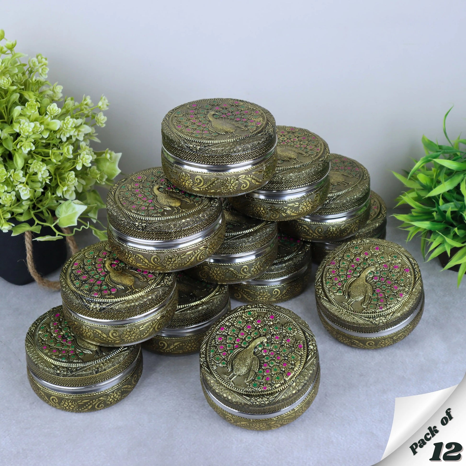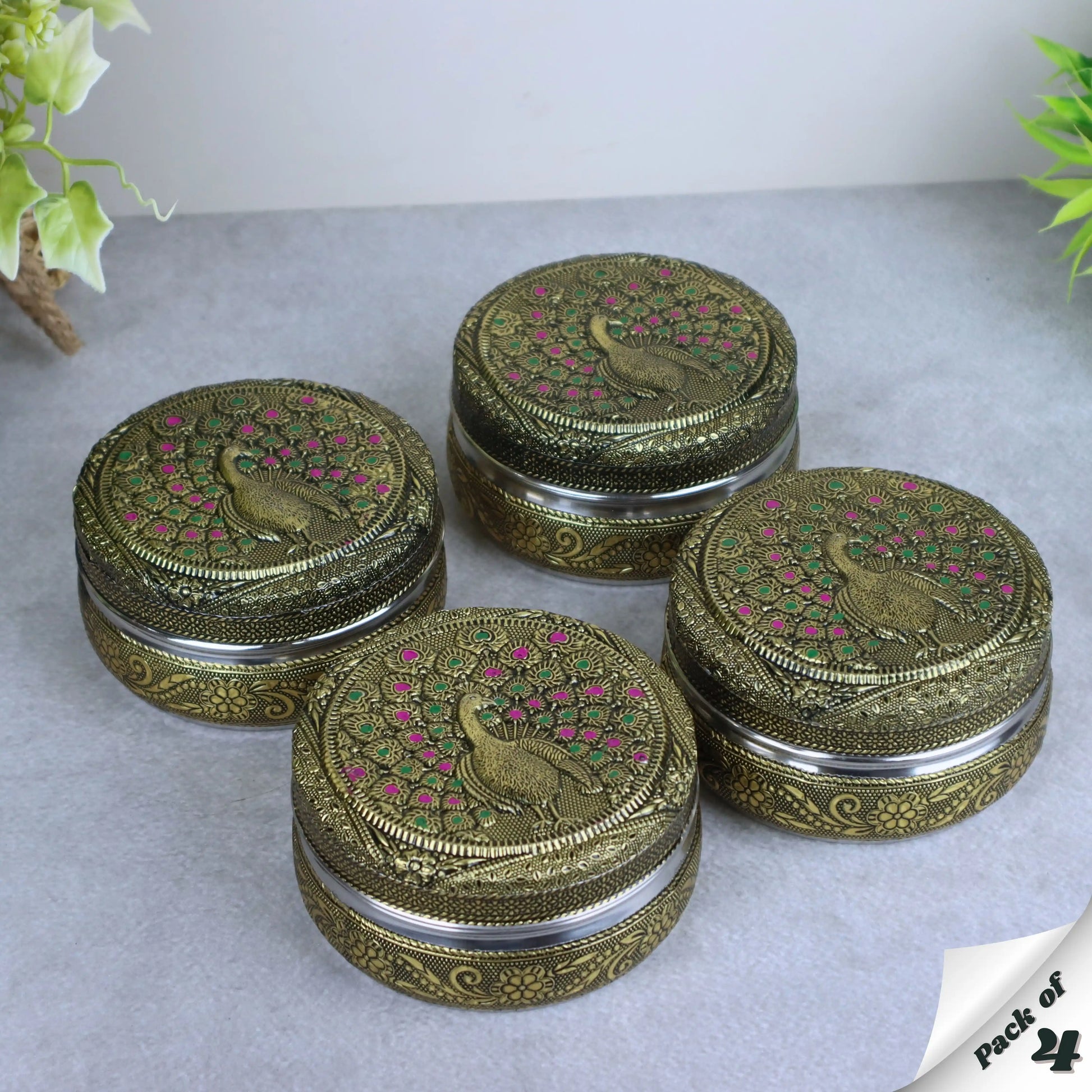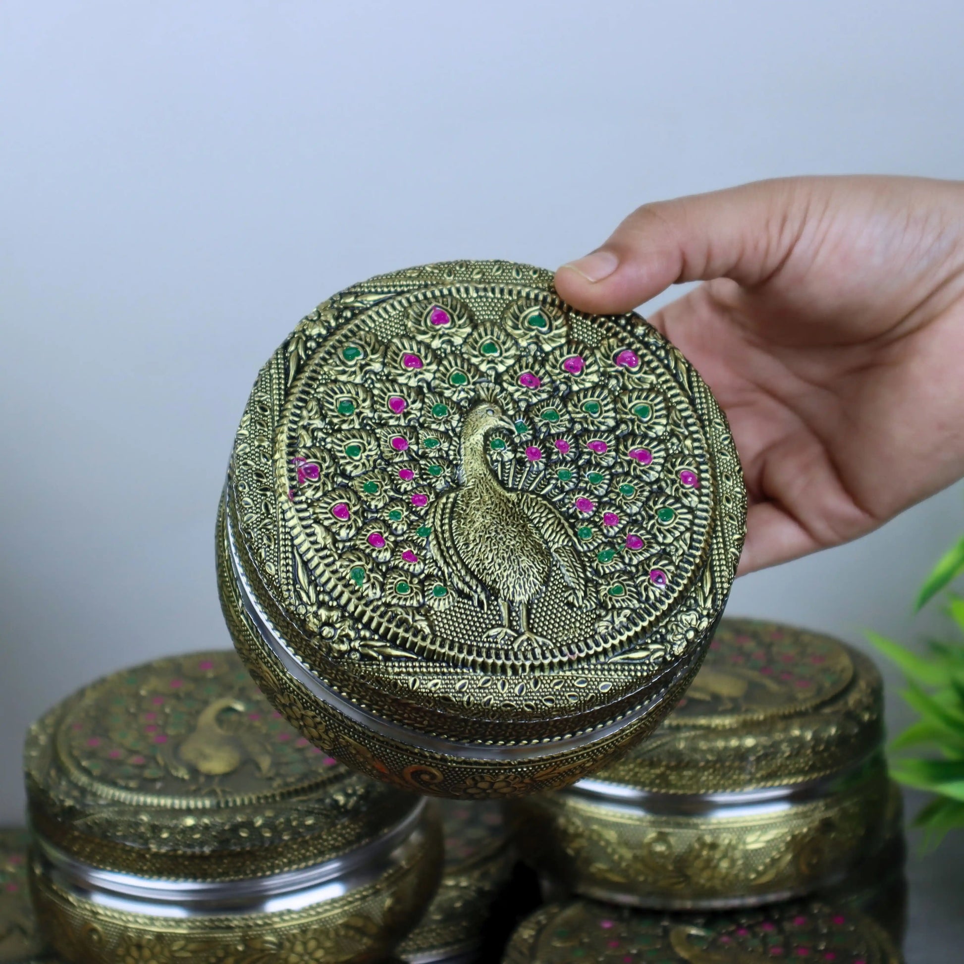 Meenakari Peacock Embossed Stainless Steel Dabri – Puri / Poori Box / Poori Dabba, Tiffin Box & Kitchen Dabba | 500 ml | Return Gift