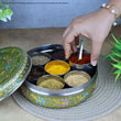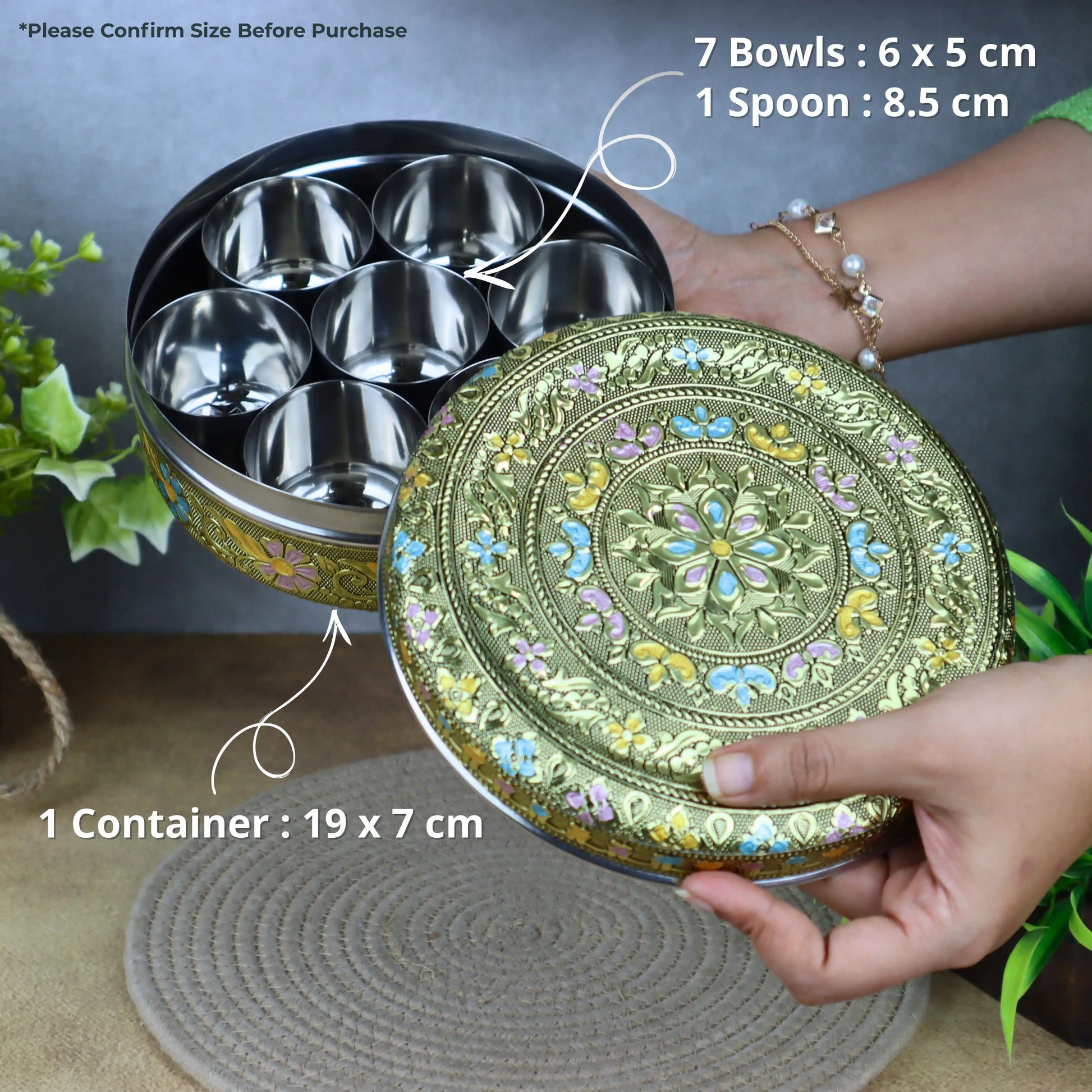 Spice Box Stainless Steel Masala Box | Papad Dabba | Golden Meenakari Container with 7 Bowls & Spoon | Return Gifts