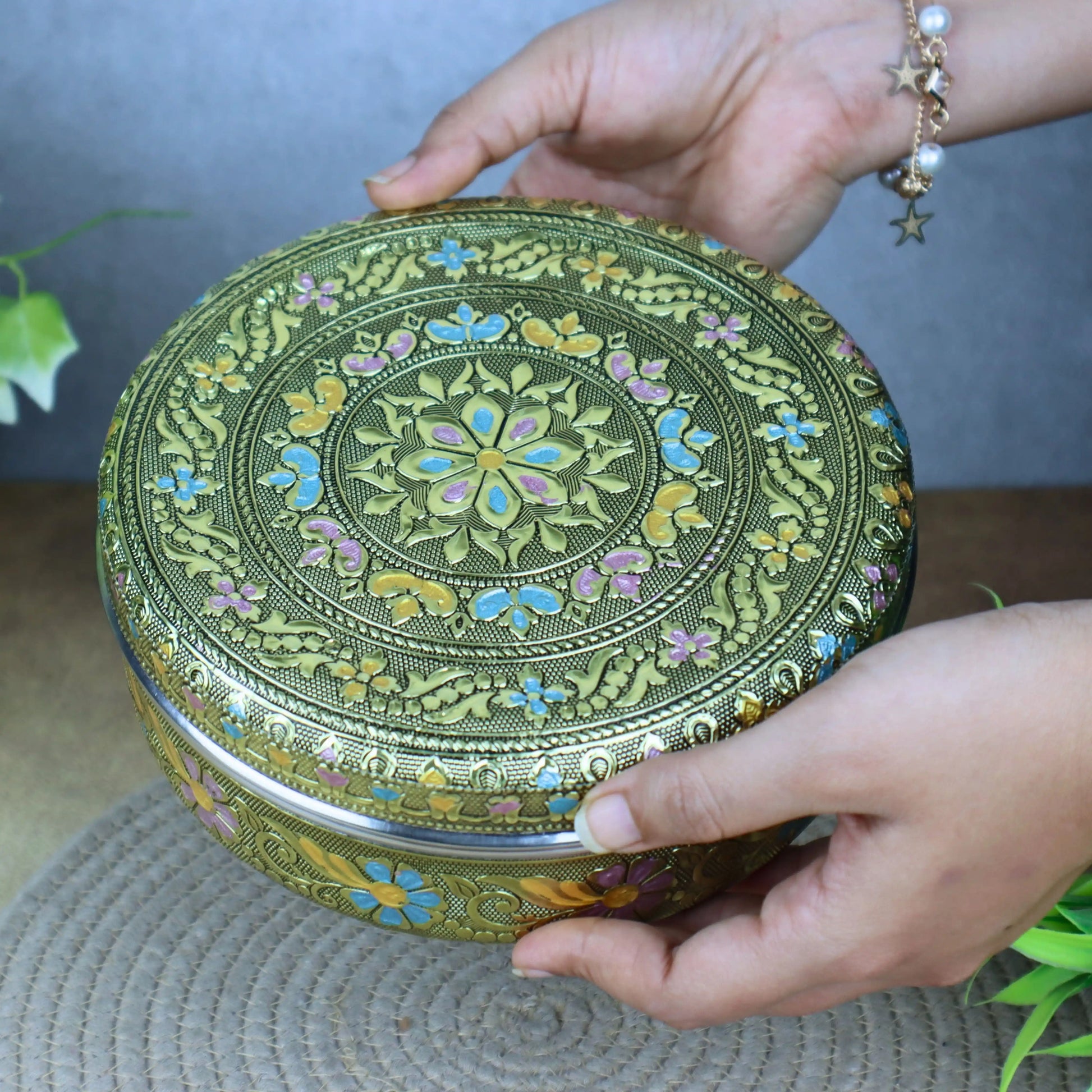 - Traditional Meenakari Design: Handcrafted floral meenakari patterns for an authentic Indian touch.
