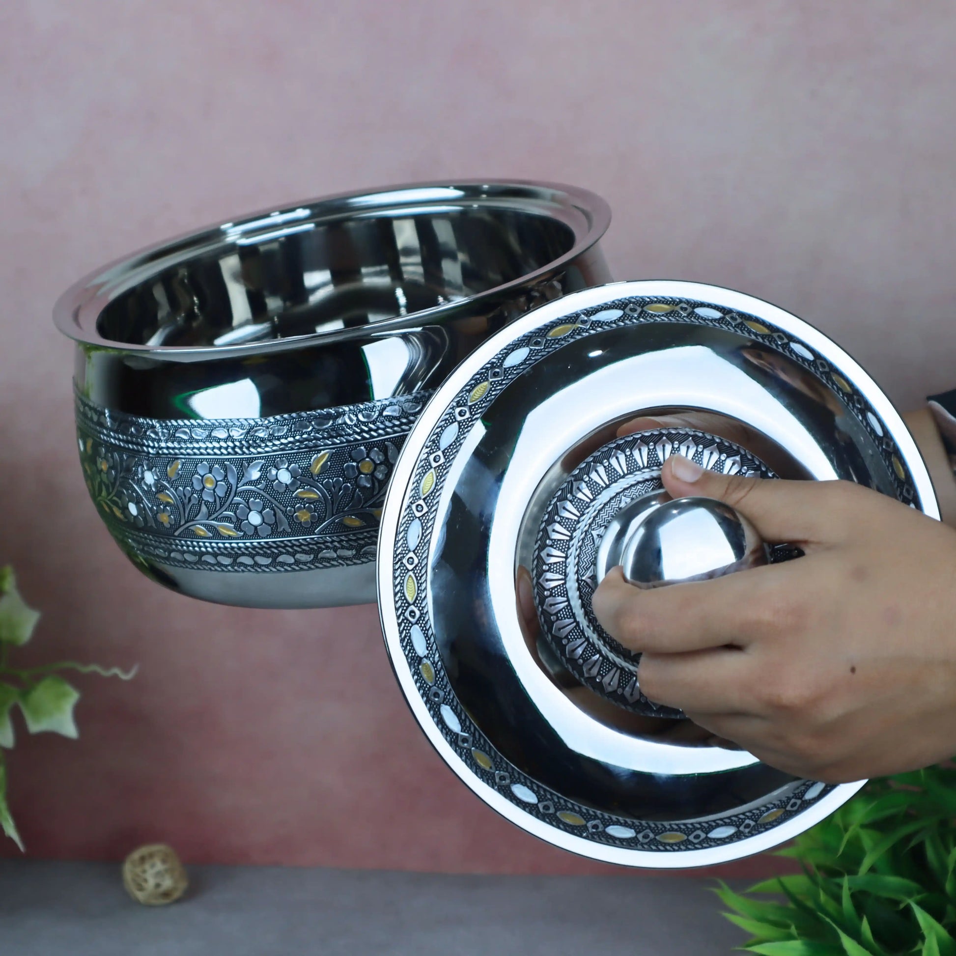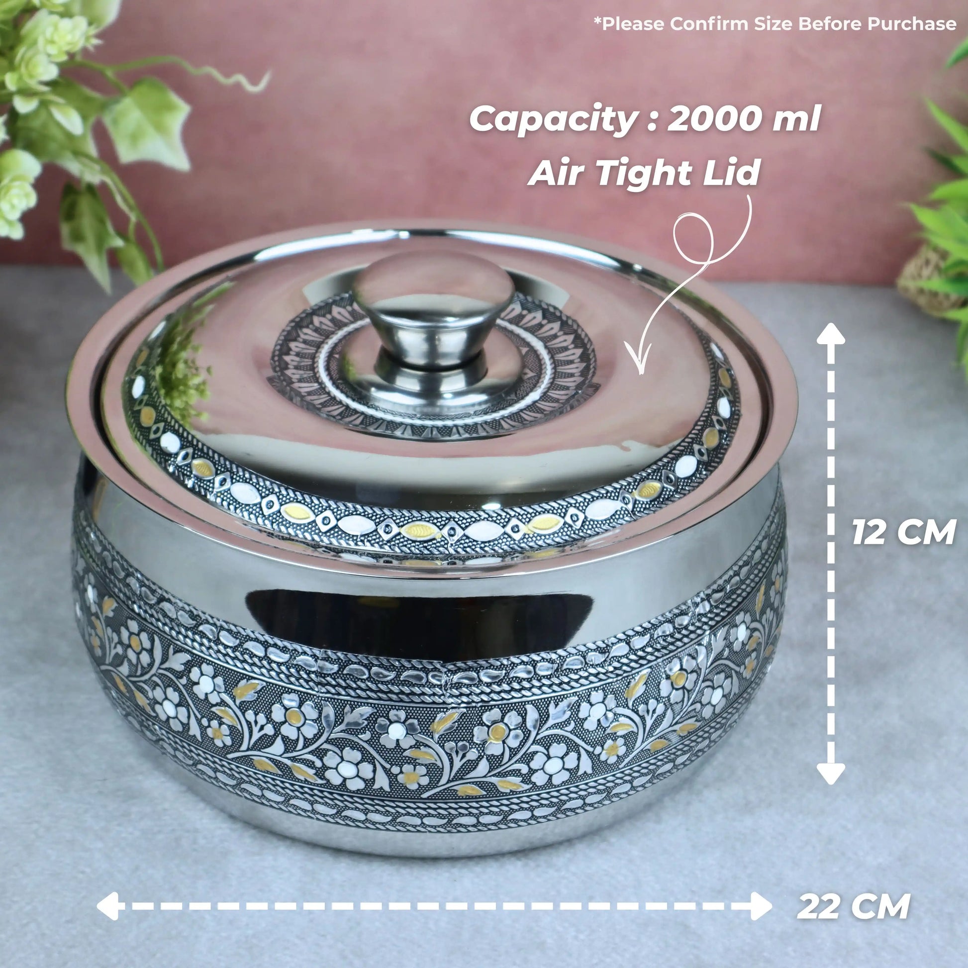 Stainless Steel Casserole / Hot Pot with Lid – Silver Oxidized Meenakari Chapati Box, Hot Case & Serving Pot | Ideal Return Gift