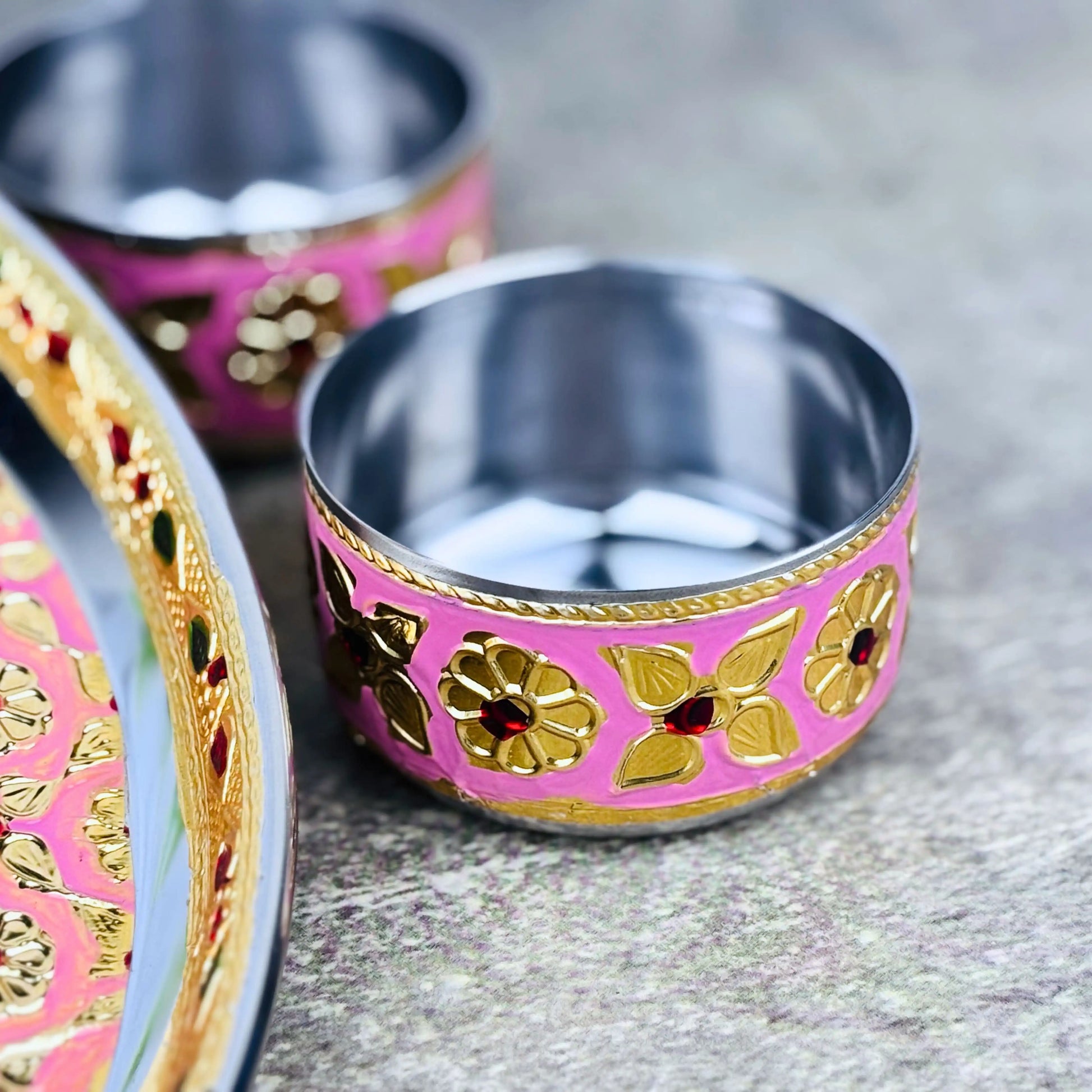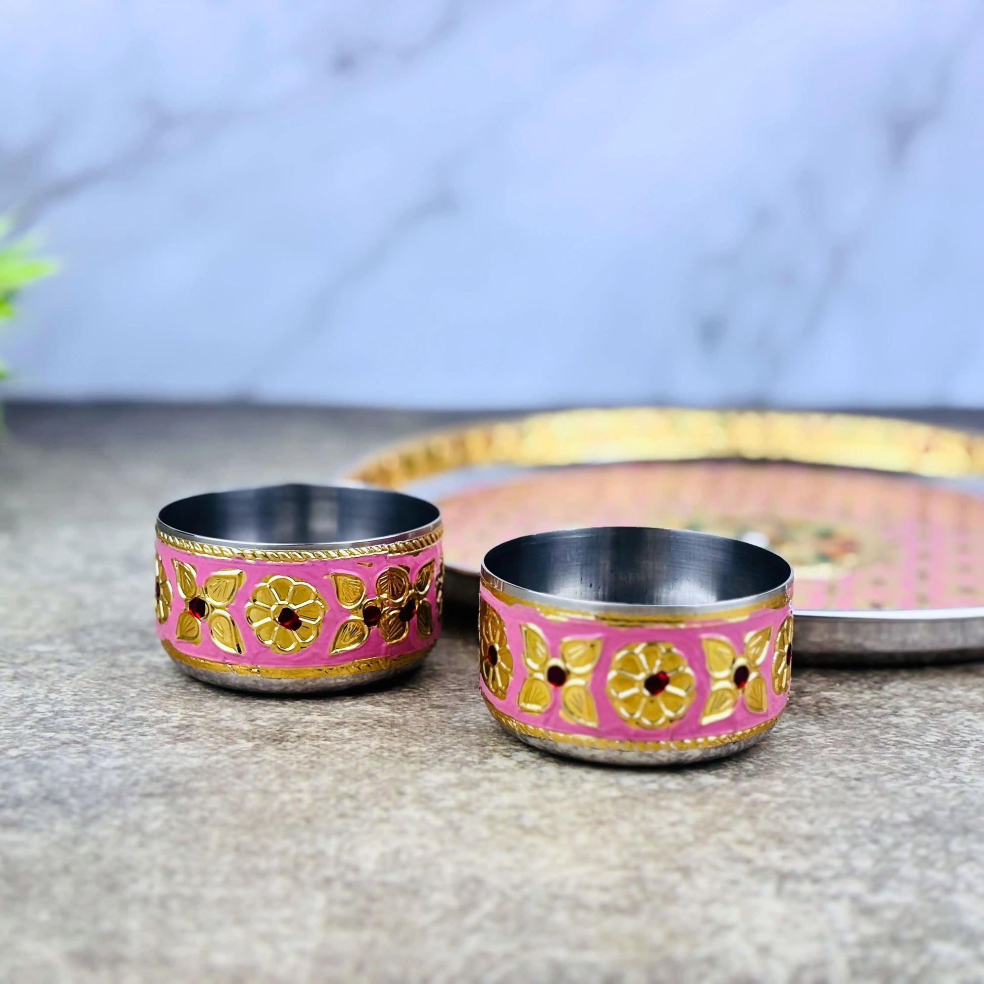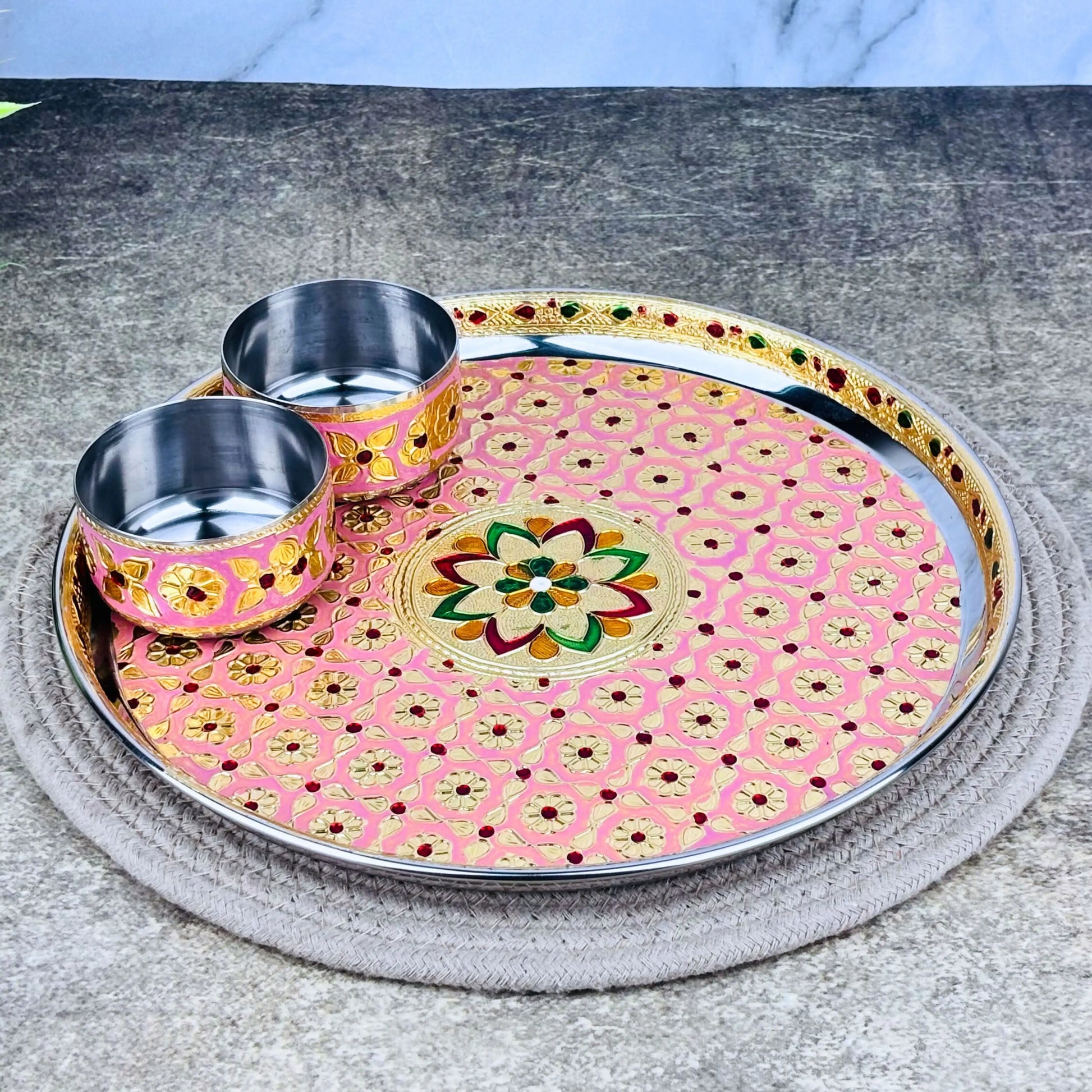 Product Includes :- 1 Meenakari Pink Floral Pooja Thali Set with 2 Bowls